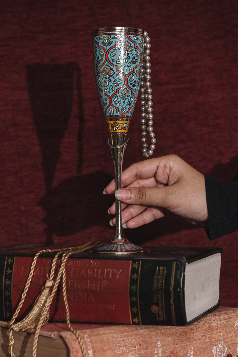 Expertly handcrafted from nickel-plated solid brass, it showcases an intricate Floral Jaal engraving, reflecting timeless craftsmanship and artistic finesse. Whether for an intimate soirée or a grand celebration, this glass is designed to impress.